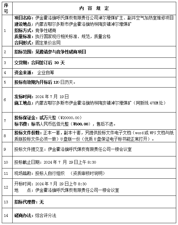 伊金霍洛旗呼氏煤炭有限責(zé)任公司淖爾壕煤礦主、副井空氣加熱室維修項(xiàng)目競(jìng)爭(zhēng)性磋商邀請(qǐng)書